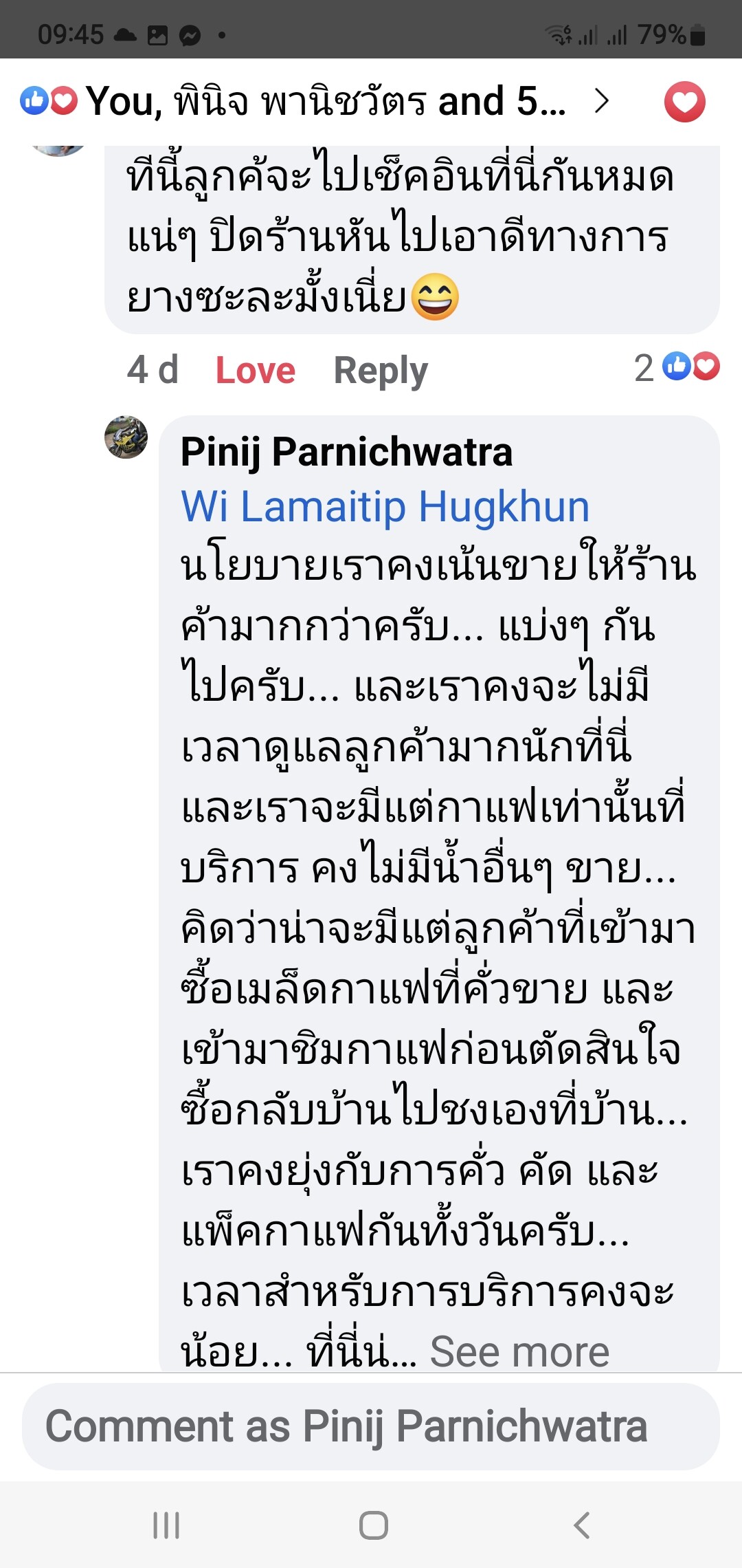 คืออยากให้ร้าน​ 20 กว่าร้านในรัศมี​ 10 กม.​ ได้ขายกันบ้างด้วย​ และช่วงนี้ไม่มีเวลาเปิดหน้าร้านอีกด้วยครับ​ แค่คั่ว​ คัด​ แพ็ค... งานเต็มมือกับคนงานสองคนแล้วครับ... ปัญหา​ตลาดไม่มี​ แต่มีปัญหา​เรื่อง​หากาแฟดีๆ​ มาคั่วไม่ทันขายครับ​ กาแฟดีจริงๆ​ หาไม่ง่ายครับ​ กาแฟไม่ใช่ทุกสวนจะอร่อย​เหมือนๆ​ กัน... ผมซื้อสวนไหนต้องเก็บเป็นความลับ... เพราะถูกแย่งเมื่อคนอื่นรู้