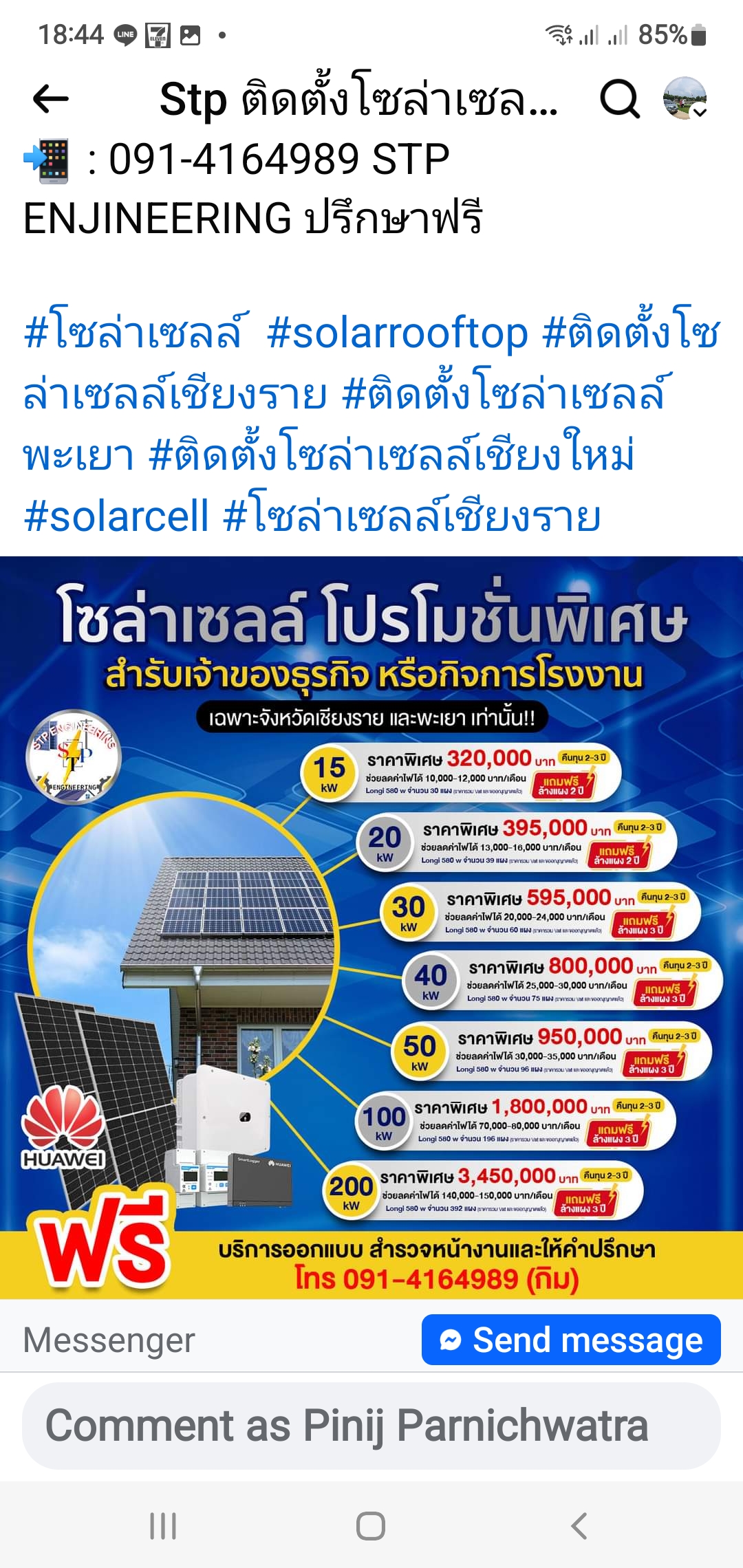ค่าอุปกรณ์อินเวอร์เตอร์และอื่นๆ อีก สามสี่หมื่นไม่น่าเกินนี้ ค่าติดตั้งบนหลังคาอีกหมื่นนึง